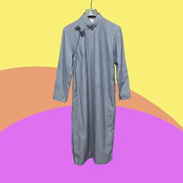 二手 古董訂製 藍色 毛料 盤扣 開衩 長袖 旗袍 CA410