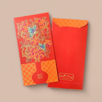 設計以花瓶為題,瓶與「平」同音,在中國傳統上,花瓶寓意平安,在花瓶上配上富貴之花牡丹,代表富貴平安,另一款則配上蓮花,有年年平安之意。尺寸:86 x 169mm數量:一包 10 個工藝:珠光紙 + 燙金包裝:透明膠袋接受公司或私人客製,詳情歡迎查詢。