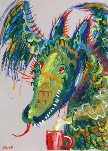 龙画原創藝術恐龍與咖啡藝術幻想異想天開的繪畫有趣的藝術品插圖由 Anna Onik✓ 標題:早上喝咖啡的搞笑龍✓ 材料:康頌紙、專業水粉(耐光)✓ 尺寸:30x40 厘米(11.8x15.7 英寸)✓ 100% 手工製作,原畫謝謝你支持我的藝術!