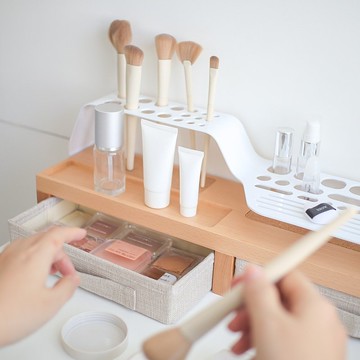 https://live.staticflickr.com/65535/54562296045_56564958a7_o.pnghttps://live.staticflickr.com/65535/54562524700_97ce498eae_o.png這款雙抽化妝品架專為日常桌面整理設計,整合插放與分類功能於一體:■上層洞洞插槽:可插入多支化妝刷、美妝蛋等工具,通風設計避免潮濕與發霉■中層木平台:可放保養品、香水、飾品與日常使用瓶罐■下層雙抽收納:布質抽屜可收納耳環、棉花棒、髮圈與備用用品░保養撇步░木頭表面髒污可使用抹布沾微量冷水輕輕擦拭,放置通風環境自然陰乾。░退換貨說明░因運送過程產生之瑕疵、本身之瑕疵,可於到貨日七個工作天內與我們更換新品實木產品每一件的紋理都獨一無二,可能帶有少少的斑剝疤結以及細小裂痕,皆屬自然現象。