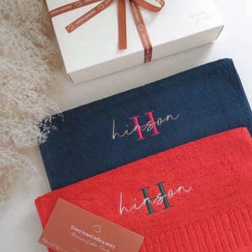 Cotton Painter®香港毛巾品牌曾獲《CAPITAL資本雜誌》專訪報導,我們的毛巾由原材料、生產和包裝都經由我們自家設計。原材料採用100%美國棉,確保每條毛巾柔軟耐用高品質,並提供客製化繡名服務,適合自用或送禮。2023年,我們榮獲「年度最優秀專業禮品定制服務」獎項。新上架Pinkoi,一件免運,立刻下單!【第1條毛巾】毛巾顏色:Blueberry字體:#B線色:Red & Gold**大階字母:H** (例子如圖片所示)**細階英文名:hinson** (例子如圖片所示)【第2條毛巾】毛巾顏色:Caramel字體:#B線色:Green & Silver**大階字母:H** (例子如圖片所示)**細階英文名:hinson** (例子如圖片所示)請客人於備註中提供 **[大階字母]** 及 **[細階英文名]**(字數限制:大階字母1字元,細階英文名15字元內)--------------------------------------------------------------------------------------------__毛巾尺寸__**小毛巾** 用作面巾或擦手 (35cm x 35cm)**大毛巾** 用作面巾或擦手,以及運動時掛頸吸汗 (75cm x 35cm)**大浴巾** 用作沐浴擦身,尺寸足以包住整個身體 (138cm x 70cm)__包裝方式__**環保裝** 包括繡名毛巾+禮品卡 (不包括禮盒,適合自用或自行包裝)**禮盒裝** 包括繡名毛巾+禮品卡+英文名牛油紙 (包括禮盒,適合送禮)__製作時間__**一般訂單** 7個工作天 從香港寄出**急件訂單** 3個工作天 從香港寄出 (請聯繫我們為準)__購買須知__- 以上款式均可自由配搭,如客人沒有特別註明,我們默認圖片所示製作- 請確保已填寫的資料無誤,付款後我們立即開始為您製作,製作後不得更改- 所有毛巾都是客製化,也是貼身物品,基於衛生理由不提供退款/退貨或換貨服務- 禮品內包括一張毛巾清洗卡,請依照我們的「初次清洗方法」處理毛巾- 堅持採用日光拍攝,建議在正常日光下看比較接近原相- 最後,感謝您的支持,歡迎下單!