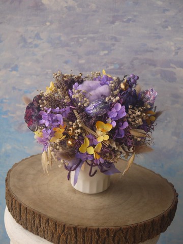 紫色薰香.薰衣草色調.生日.升遷.開幕.乾燥.永生花送禮首選.紫色的煙,輕輕地繞,薰香的煙霧,是愛情的絮語.在夢裡.我們相遇.願這份美好.永不消散.純手工製作所以與照片會有一點點的小差異花禮尺寸長寬高約16-17-19cm**使用材料**免尾草.滿天星.不凋繡球花.....乾燥花.永生花.不凋花有些材料會依照季節有所調整**出貨包裝**會使用紙盒綁上鍛帶出貨**出貨方式**如選擇交貨便寄出到送達時間為3天例:星期一 13:00寄貨,星期三 13:00可取貨 (超過17:00寄貨視同次日寄貨)為使花禮完整送達部份花禮不提供交貨便服務.**適用場合**花禮材料利用不凋花(恆星花.永生花)及乾燥花等材料製成.所以可以長時間擺放,不需要澆水及日照.適合居家擺飾.生日送禮及個人辦公桌裝飾.**清潔與保養**不凋花(Preserved Flower)又稱為恆星花或永生花。 原自法國,近年在歐美日本等地流行。 使用鮮花利用特殊加工製成,不需澆水日照可放2至3年。 不凋花的保存方法 不凋花擁有和鮮花一樣保有水分的質感可以長時間保存觀賞。 避免高溫多濕的環境,和陽光直射的地方。 沾上灰塵時,可以用吹風機冷風輕吹或是利用軟毛刷輕輕擦去。 乾燥花(Dry&Handmade Flower) 乾燥花大多利用自然風乾製成,在加以退色上色,拼接製造成不同的質感及樣貌。 乾燥花的保存方法 避免高溫多濕的環境,和陽光直射的地方。 沾上灰塵時,可以用吹風機冷風輕吹或是利用軟毛刷輕輕擦去。【注意事項】 ※商品圖片會因個人電腦螢幕設備不同而有所些微色度差異,商品依實際供貨樣式為準。 ※此類商品如經拆封、使用、或拆解以致缺乏完整性,恕無法退貨!#花生maniFlower#乾燥花 #永生花 #不凋花#捧花 #新娘捧花 #婚禮捧花#乾燥花束 #花束#情人節 #聖誕節 #交換禮物#生日 #生日禮物#婚禮小物 #七夕情人節禮物#開幕 #升遷