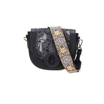 百變換蓋真皮馬鞍包 - 金幣緹花(黑)