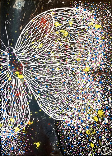 蝴蝶繪畫《耀眼的未來》 Butterfly Painting - Sparkling Future畫面中有一隻白色的蝴蝶,代表獨立、明瞭、透亮的性格。在牠翅膀的邊緣發散了數百個彩色的小方塊,猶如亮片般在深色的背景下閃閃發光,讓作品充滿無限活力及生命力。小方塊用來形容夜空中的小星星,代表滿滿的願望,也用來描繪生命中各種意義,它們像是被封存的經驗,或是曾來過生命中的人事物,或是對未來的希望。彩色的小方塊,隨著風開心地在空中閃耀著光芒。如同作品呈現的畫面,這是一個耀眼的未來,無論將來如何,就在今天此刻做一些特別的事情,留下如亮片般璀璨的生命經驗,讓它們在你的生命中閃閃發光,成為推動成長的養分。耀眼的未來,充滿詩意的冒險世界,我們跟著蝴蝶的律動一同舞蹈,遇見屬於您和我的美好未來。台灣是熱帶及亞熱帶間的島嶼,擁有許多不同型態的生態系,因而蝴蝶的品種多樣,生物學家給了台灣蝴蝶王國的美名。這也是我喜愛用「蝴蝶」來當繪畫主角的原因,蝴蝶的身形很像人,畫中的蝴蝶就像是生長在台灣的您我。透明蝴蝶的靈感,來自亞馬遜雨林的神奇蝴蝶,牠們的雙翅如玻璃般透明,您可以從他的翅膀中看到森林一草一木,畫面充滿謙遜與祥和,萬物彼此尊重,接受來到生命的一切。期待您會喜歡這幅寧靜清透的作品,一幅與大自然融為的畫面。尺寸:50 x 69.5 cm媒材:畫布、壓克力顏料**所有電腦和手機的顯示顏色都不相同,畫作可能與您在屏螢幕上看到的圖像顏色略有不同。**