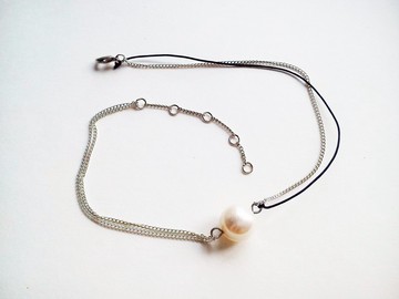 Sea Breeze系列手鏈,腳鏈,項鏈系列靈感來自夏季出海時看見藍綠色的海洋.用不同程度的 藍綠色彩帶作陪襯配以帶粉紅光澤的淡水珍珠看上去不但新鮮年輕而且有猶如被海風包圍的感覺。只看相未必有感覺,試上手才更實在.此腳鍊用淨銀色銅鍊,在太陽照射下會閃爍如夏季的海面。物料:淡水螺紋珍珠,銅鏈,深藍色珠寶繩長度: 26cm保養:銅鍊會蛻色或變色,配戴後用抹銀布清潔。建議穿深色衣物才穿戴,避免弄污。產地/製造方式手工製作