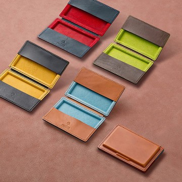 尺寸 _ 寬108 × 深75 × 高15 (mm)材質 _ 牛頸背皮革、豬麂皮日本製造**[磁吸式設計,開闔流暢俐落]**在以皮革熱塑成型的凸起處內藏了磁鐵。透過磁力作用,實現流暢的開闔,讓遞交名片的瞬間更顯專業。https://live.staticflickr.com/65535/54617084614_c61b20c3fa_b.jpghttps://live.staticflickr.com/65535/54617107763_1565992f73_b.jpg**[傳統工藝與現代技術的完美融合]**植物鞣製的牛皮革,透過浸濕、壓製成型,得以呈現豐富的機能與不受限的優美線條。此「革絞」技法雖源遠流長,但我們結合了3D數據建模與CNC銑床技術,得以精準切割模具,實現複雜而細膩的立體塑形。https://live.staticflickr.com/65535/54617097039_81ccd9de22_b.jpghttps://live.staticflickr.com/65535/54617111488_31de9752be_b.jpghttps://live.staticflickr.com/65535/54617209585_5bd8b56324_b.jpg**[繽紛內襯,增添一抹玩味]**外層皮革提供沉穩的經典黑、棕、駝色,並加入質感藍,共四種選擇。內裡則採用色彩鮮豔的豬麂皮,為您的名片夾注入個性。https://live.staticflickr.com/65535/54617110313_1197ed62c5_b.jpghttps://live.staticflickr.com/65535/54617111473_2bf7fac586_z.jpg**[嚴選牛頸背皮革,期待歲月留痕]**採用日本兵庫縣龍野市鞣革廠,以植物單寧鞣製的牛皮革。儘量減少表面加工,忠實呈現皮革的原始紋理與迷人的經年變化。https://live.staticflickr.com/65535/54617063754_e21594951c_b.jpg**[日本職人精湛手藝,細膩縫製]**簡約的方形設計,容不得絲毫馬虎。由經驗豐富的職人悉心縫製,成就完美細節。https://live.staticflickr.com/65535/54615986532_4c990c0b92_b.jpghttps://live.staticflickr.com/65535/54617177350_5babffce3d_b.jpghttps://live.staticflickr.com/65535/54617088294_cb9be360f3_b.jpg・可完美收納標準名片尺寸 (91×55mm)。 使用172kg厚度的名片,單側約可收納15張 (兩側合計約30張)。・附有品牌標誌烙印的精美包裝。https://live.staticflickr.com/65535/54617106664_1c2037e353_b.jpg