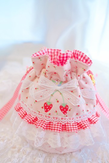 整個包包就像是一顆Strawberry Shortcake!🎂外圍的一圈蕾絲 就像是蛋糕的鮮奶油正面圖案是剛採收好的蝴蝶結草莓🍓背面圖案是烘培完的草莓蛋糕🍰這款小包包底部是正圓形 有加厚!裝東西進去也不會塌塌的~容量也蠻大的🩷尺寸18*17公分 底部是直徑14公分的圓形手提背帶是可拆式 拆下來也可以當作手機掛鏈使用~包包可以側背&手提包包都會附一條珍珠斜背鏈&圖中的手提背帶也可以加購 甜甜草莓背帶🍓搭配起來超級可愛!!!