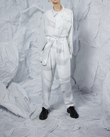 **2022SS TRANSLATE**https://images.squarespace-cdn.com/content/v1/568d0036dc5cb4a5b51b342a/cf95c00d-90a3-442f-a818-e7edb10d1f4a/INF+22SS+TRANSLATE.png?format=1500w|**靈感**|靈感來自翻譯與轉換的概念,”將2D翻譯(轉換)成3D,人翻譯(轉換)成魂,恨翻譯(轉換)成愛”;透過翻譯與轉換,讓我們學習到從不同的角度去看待事物,一個事件的本質並不是那麼絕對,而在翻譯與轉換的過程中我們也獲得了一些意外的收穫,不同於生活中的小確幸,而是學習用一種更為宏觀、豁達的角度去看待世界。細節取樣自台灣早期地方信仰與本土妖怪等元素,並與今年12月即將重新登上院線 - 最知名國產動畫-《魔法阿媽》聯名,使用劇中角色酷羅(貓)、小扁(蛇)、Apple(抱著娃娃的小女孩靈魂)等做為素材,並致敬電影剪輯技術「蒙太奇(Montage)」,將角色以拼貼手法融合民俗信仰中畫符的手寫筆觸,打造出滿版且多彩的服飾印花。除了透過時裝展現出台灣在地信仰文化與台灣早期的風土民情外,本季也使用將2D變3D的「Trompe L’oeil」(錯視畫法)的繪畫技法,不斷觀察生活中時裝的光影變化,並以深淺不同的平面色塊重新描繪出《魔法阿媽》劇中角色般的明暗與細節,並運用於服飾印花上,整套服裝穿上後,宛如從動畫中走出的人物一般,看似平面(2D)又看似立體(3D),呼應了品牌本季主題 Translate,翻譯、翻轉出夾藏在平面與立體之間2.5D的韻味,創造出本季富含個性亦帶點可愛氣息的都會時尚印花。 INF品牌不斷地『以文化為底蘊,以時裝為載體』,並透過系列服飾製作重新詮釋台灣古今的多元文化與故事。|**設計**|服裝版型上將正統西裝褲與較休閒版型的老爺褲解構與重塑,在經過多次實驗、不斷重新打樣之後確立了褲頭活褶的位置安排與份量,讓穿者能夠呈現出最修身最完美的比例。搭配我們對褲管版型的精雕細琢,巧妙的以微小的角度一路收進褲口的弧線剪裁;在單側褲管把腰間口袋內襯解構至外層,創造出腰部線條上的多層次效果,同時也呼應另一邊褲管在外層膝蓋上的解構口袋,打造出輕鬆穿搭卻有著豐富視覺的要求;此款商品為呼應品牌十週年,也特別將品牌LOGO電繡在褲身解構出的口袋上。 印花上致敬喜愛的美國裝置藝術家Alexa Meade,她擅長2D變3D的「Trompe L’oeil」(錯視畫法)的繪畫技法,以真實人物或立體的裝置作為畫布,再將這些立體的人事物繪畫成平面油畫的藝術風格;藉由不斷觀察生活中時裝的光影變化,並使用「2D上色技法」,以深淺不同的平面色塊重新描繪出《魔法阿媽》劇中角色般的明暗與細節,並運用於服飾印花上,穿上後宛如從動畫中走出的人物一般,看似平面(2D)又看似立體(3D)。 穿搭上除了穿搭上除了搭配同系列印花上衣作為套裝外,也可以搭配本季較休閒版型的短袖上衣來襯托出寬褲原有的版型設計。https://images.squarespace-cdn.com/content/v1/568d0036dc5cb4a5b51b342a/489bc70e-bee3-42d9-b789-e8bca44eae8c/INF+Multi-Layers+Harlem+Pants+with+Pockets+in+2D+White+%284%29.jpg?format=2500whttps://images.squarespace-cdn.com/content/v1/568d0036dc5cb4a5b51b342a/4ea71065-0298-486c-a589-86260faf9e44/INF+2D%E7%99%BD%E5%8D%B0%E8%8A%B1%E5%A4%9A%E5%8F%A3%E8%A2%8B%E8%A7%A3%E6%A7%8B%E8%80%81%E7%88%BA%E8%A4%B2+%282%29.jpg?format=2500whttps://images.squarespace-cdn.com/content/v1/568d0036dc5cb4a5b51b342a/a42d7ce8-16b5-4b2a-8c88-04c77e52e92f/INF+2D%E7%99%BD%E5%8D%B0%E8%8A%B1%E5%A4%9A%E5%8F%A3%E8%A2%8B%E8%A7%A3%E6%A7%8B%E8%80%81%E7%88%BA%E8%A4%B2+%284%29.jpg?format=2500whttps://images.squarespace-cdn.com/content/v1/568d0036dc5cb4a5b51b342a/253b18f7-749e-47f5-8c5d-dcc96d4f293d/INF+2D%E7%99%BD%E5%8D%B0%E8%8A%B1%E5%A4%9A%E5%8F%A3%E8%A2%8B%E8%A7%A3%E6%A7%8B%E8%80%81%E7%88%BA%E8%A4%B2+%285%29.jpg?format=2500whttps://images.squarespace-cdn.com/content/v1/568d0036dc5cb4a5b51b342a/166be025-6b33-467f-b988-ccde4e089408/INF+2D%E7%99%BD%E5%8D%B0%E8%8A%B1%E5%A4%9A%E5%8F%A3%E8%A2%8B%E8%A7%A3%E6%A7%8B%E8%80%81%E7%88%BA%E8%A4%B2+%283%29.jpg?format=2500whttps://images.squarespace-cdn.com/content/v1/568d0036dc5cb4a5b51b342a/b5096aa7-3e25-40f2-b5a3-3c14c5028608/INF+2D%E7%99%BD%E5%8D%B0%E8%8A%B1%E5%A4%9A%E5%8F%A3%E8%A2%8B%E8%A7%A3%E6%A7%8B%E8%80%81%E7%88%BA%E8%A4%B2+%281%29.jpg?format=2500w|**材質**|聚酯纖維|**顏色**|2D白|**洗滌方式**|可機洗低溫整燙不可漂白不可烘乾**INF 22SS臺北時裝週品牌秀**https://youtu.be/WwRmhzj5Glo