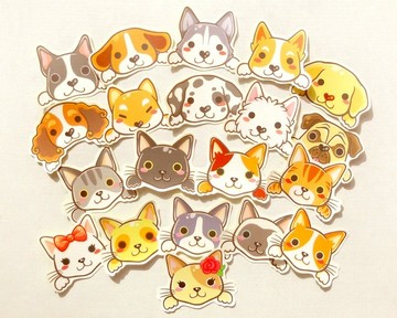 //貓狗貼紙組// 可用在手帳, 包裝, 卡片, 手機。。。任何喜歡地方隨你貼!♥ 每包有20張貼紙: 貓咪款式10張 + 狗狗款式10張♥ 商品為手工剪製,因此收到的商品多少會與圖片中不同♥ 尺寸說明: 每張貼紙約 5 cm 長 x 5 ~ 6 cm 寬♥ 貼紙材質說明:- 模造貼紙 (可書寫.不防水)- 亮模貼紙 (表面防水,背面不防水)♥ 請注意: 螢幕亮度與實體照片難免有些許顏色誤差★ 購買前請注意: 本設計館為個人設計師獨立經營,月營業額未達標準,因此無法開立發票或收據,還請見諒!-----------------------------------------------------------------------------------------------產地/製造方式: 台灣製造 // Made in Taiwan by BeagleCakesArt