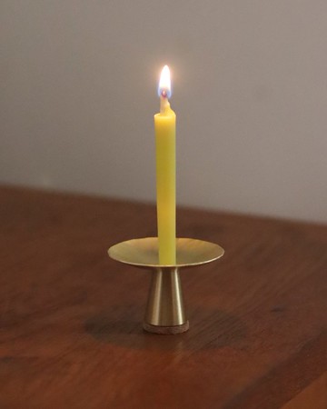 這是一款專為 1 號尺寸蠟燭製作的高腳燭台。以富有手感的黃銅打造,盤面上施有鎚打紋理,讓搖曳的燭火柔和地反射出溫暖的光暈。高台部分採用實心黃銅製成,穩重而安定。底部貼有軟木墊,可防止熱度傳導至桌面。照片後段所示的小型豆蠟燭也能搭配使用,但外觀上會稍微浮起。尺寸:約 φ50mm × 高 約46mm※ 不附蠟燭。黃銅燭盤未經上漆處理,會隨時間與使用逐漸沉澱出更深的色澤與風味。黃銅與純銅具優良導熱性,且具抗菌特性,為衛生且耐用的金屬素材。[ 保養方式 ]黃銅與銅因導熱佳且具抗菌性,是衛生又安心的材質。日常保養僅需以中性清潔劑清洗即可。隨著時間推移,表面會逐漸變深或略顯霧面,這正是其獨特的歲月風韻。若想恢復原本光澤,可使用小蘇打或牙膏輕柔拋光,並徹底乾燥。[ 注意事項 ]・點燃時,盤面與高台會變得非常燙,燃燒中與剛熄滅後請勿觸碰。・接觸酸性或鹼性物質可能導致變色或褪色。・表面若出現氧化色斑或細微刮痕,屬於材質特性,敬請理解。每件作品皆為手工製作,紋理與尺寸略有不同,皆為獨一無二的個體。made in HAYAMA2507
