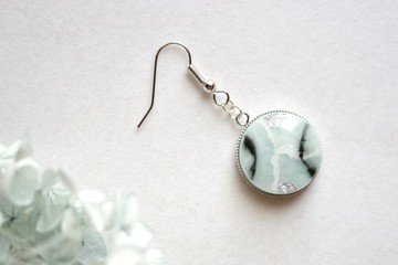 以樹脂製作的圓形耳環♪白與藍的大理石紋樹脂搭配黑白線條,形成猶如天然石的紋路,展現獨特層次感。 整體氣質清新、端莊。 帶有靜謐與懷舊感的配色,非常適合夏季或冬季穿搭。無論是即將到來的聚會或出遊,都很推薦配戴(*´∀`*)◆ 材質 ◆ 樹脂◆ 尺寸 ◆ 全長:5 公分 樹脂部分:20mm*若有金屬過敏或不適應電鍍材質者,建議避免購買。 產地/製作方式 產地:日本 手工製作