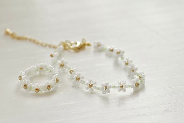 [關於 午夜的森林]店主喜歡花和森林,很晚睡。通常會在深夜望著月亮發呆時產生創作靈感。希望藉著製作花朵主題的飾物,治癒同是惜花之人的心靈。期待大家戴著心愛的飾品,到郊外漫步,親近大自然。[簡介]<小花朵米珠戒指手鏈set。純白色系> 還是小學生的時候,曾被媽媽帶到五彩繽紛的串材手作材料店,買了大包小包的小珠創作心愛款式的飾物。長大後,這份少女情懷並沒有被歲月洗劫,而大自然對世界的滋潤成了主要的靈感泉源,把天空海浪、嬌花嫩葉的絢麗色彩一粒一粒地注進飾物裡,跟身邊的人分享。[作品尺寸]手鏈圍約 130mm - 190mm戒指圍約 50mm - 56mm*如需特別尺寸請聯絡設計師[作品材質]壓克力膠、魚絲、金屬[注意事項]手作物品每件會有輕微差異,請見諒手作物品較為脆弱, 請溫柔對待, 請勿大力拉扯金屬部分隨時間流逝會自然氧化變暗,屬正常現象可使用拭銀布或洗銀水減輕氧化情況