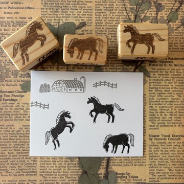 ************************此商品有加購選項。購買前請仔細確認後再下單。************************感謝您的瀏覽。2026年是馬年。這是馬兒們在牧場悠閒生活的印章組。若與加購的馬廄組(馬廄&柵欄&樹木)一同蓋印,便能營造出田園詩般的牧場風情。用牧場色調蓋印,呈現悠閒的牧場風格。用鮮豔的色彩隨機蓋印,打造獨特的織物風格。由於是單純的色塊印章,即使是單色印泥或漸層色印泥,都能呈現出眾效果。新年賀卡季節以外也能盡情使用。與另件販售的牛兒印章組尺寸感相同,可一同蓋印,打造出富有空間感的廣闊牧場。2025年內購買限定贈送立牌造型的「2026」年份印章♪(※年份印章不含持ち手)可搭配您現有的文字印章製作新年賀卡♪除了新年賀卡,也可運用於手作紅包袋或日式雜貨等!也可作為朱印使用。※馬廄組(馬廄&柵欄&樹木)為加購價800日圓。 如需購買請於加購選項中勾選。 馬兒組1400日圓 + 馬廄組800日圓,合計為2200日圓。 若僅需馬廄組,請事先告知(單售1000日圓)。※新年賀卡範例中的文字印章與牛兒組為尚未販售的作品。 如有需求,請事先洽詢。※製作將在收到訂單後開始。 依製作狀況而定,預計約需2週左右的運送時間。 若情況緊急或擔心到貨日期,建議選擇レターパックライト(遞送時間較短)。 請於購買前洽詢到貨日期相關事宜。《尺寸》馬兒印面...各約 縦2.5 × 橫3.5 公分。馬廄印面 ... 縦1.5 × 橫3 公分。柵欄陰影 ... 縦1 × 橫2.5 公分樹木陰影 ... 縦橫1公分《材質》使用橡皮擦版畫專用「ほるナビ」或「はんけしくん」。橡皮擦顏色有白色、黑色、棕色等(恕不指定)。持ち手使用檜木。附簡易保護印面外殼。《注意事項》・此為手工雕刻,每一個作品皆獨一無二。 若有多件販售或再販,圖像與質感可能 略有差異。 懇請理解手作商品特性後再購買。・與橡膠版不同,此為橡皮擦材質, 請溫柔細心地使用(內附使用說明書)。・著作權不放棄。請勿轉售作品、仿製販售設計(不論全部或部分)、 或未經授權將其數位化使用。