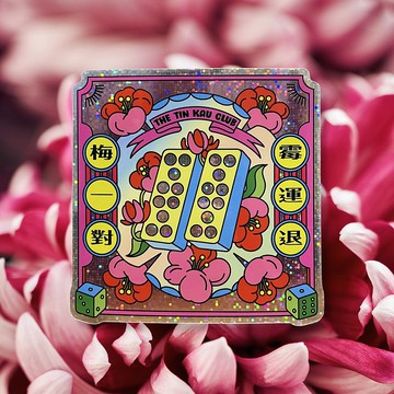 【一張可以當迷你揮春貼門口的貼紙】 梅一對 霉運退 美國製閃卡貼紙包同過往作品一樣,院友繼續將逼各位新手認牌視為己任,將骨牌元素注入設計品之中,而今年主角就係「梅牌」啦!五點加五點,型態十足兩朵梅花咁,所以話古人想像力真係好豐富。 - 4" x 4"貼紙- 一包兩張 - 美國印刷 - 同Artivive app scan出到迷幻變色效果