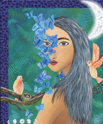 月亮女性繪畫《連結大地的夢想》Moon Woman Fairy Tale Painting - Dreams Of Wild Communion 成群向上飛翔的蝴蝶,是森林裡傳承的象徵,一代接著一代,守護著大地。穿梭於林間的鳥兒,為巢中的新生命繁忙,期待下一個世代的來到。新月是一個許願的時刻,此時月球遠離地球,萬物歸於平靜,一位目視遠方的女子堅定地許下願望:「在不遠的將來,人們的這代或下一代,又或更遠的子孫們,會懂得閱讀自然、了解自然,並與它和平共存。大地與人類將相互依存,心有靈犀。」如果您喜歡蕨類,您會發現背景是一層一層恣意生長的腎蕨。紫羅蘭色的邊康是用畫刀創作,您會發現很立體的顏色,就像一顆顆的小果實和種子。尺寸:60.5×50 cm媒材:畫布、壓克力顏料影片:https://youtu.be/gdDg0mZOEg0/此畫作於「月映脈動繪畫展」展出/《月映脈動 The Vibration Of The Moon》一場關於人、月亮、自然、萬物的展覽月亮,一個牽引地球萬物的星球,它的存在造就各式美麗的發現與探索,自古到今許多文明及部落民族都記載了對月亮的崇拜與敬仰,留下以月亮為中心的傳說、詩歌、儀式、信仰、神祇、圖騰及曆法。就算到了近代,世界各地的人們依然不自覺地被這顆高掛在夜空中的星球吸引,生活中眾多的習性仍遵循月亮運行,一些民族也承襲傳統使用以月亮為週期的日曆,如:中國的陰曆、伊斯蘭教的月曆。這些因月亮而生的事物儼然成為永恆的智慧,代代相傳。月亮的存就在如同太陽一樣,不斷地影響並且無條件地滋養著人類與萬物。來自天體的運動,無色、無味、無形、無琢,在你我的體內繞動,在富饒的大地律動。沉靜的月光映照面容,來自宇宙的光亮,教導我們喚醒原始能量。月的相貌、色澤、方位依循時空而異,新月、上弦、滿月、下弦,銀白、金黃、橙紅、藍灰,時而見,時而難尋,然而月的本質,不曾改變。月的引力,牽引含水的萬物,從深層的中心往四方漫流。無聲的共振,將萬物連為一體。森林、海洋、植物、花朵、果實、動物及人類,在月光下,牽起彼此的手,徜徉在無條件大自然的愛中,滋養、成長、療癒、修復、淨化。留一個時刻,跟隨月亮的脈動、灑落的光影,褪去腦中的制約與意識。用純粹的內心,與萬物共享、共振,彼此相連,自在流動,和諧共存。