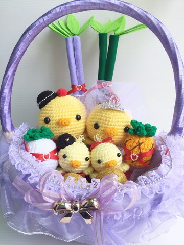 [商品名稱]可愛Q版帶路雞[商品款式]白紗皇冠款系列(紅色籃)[商品價格]每組售價1490元[商品內容]毛線公雞母雞一對約14-15公分 小雞兩隻約9公分 金蛋兩個 鳳梨一顆 好彩頭一個 竹子一對 甘蔗一對 紫色藤籃一約26CM寬*32CM高[商品運費]運費80元產地/製造方式台灣台南