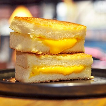 不加一滴水 100% 純鮮奶吐司製作,中間夾「雙層」濃郁起司,外層裹上奶油,撒上粗砂糖,10 分鐘烘烤出來脆皮鹹甜口感超迷人!