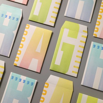 信封上的圖案,是來自美國的古董木活字拼組而成,木活字因使用而產生的缺角,為作品帶來樸拙的氣氛。雙色漸層活版印製,讓每款顏色的變化都不相同。迷你的尺寸,可裝入名片、禮金、或是各種小物。每份三入。尺寸:6.5x10.5cm印刷:活版印刷