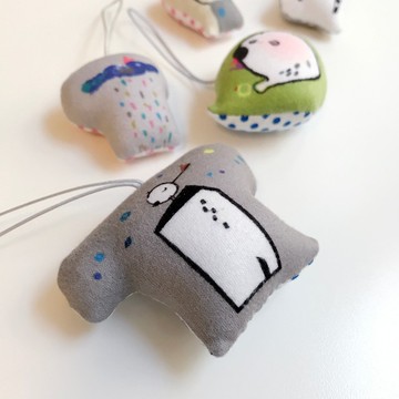 【創作者的話】**畫了些小圖...****星空下的家,飄來一朵雲,****雲上有顆心歇著,下起了彩虹雨點點,****有魚有斑馬有我的不哭鳥,****和貴公貴婦以及戴著狐狸帽的偷心小賊。****它們是小小的吊飾,****繫在包包當拉鏈頭,****也可能你的某件外套拉鏈需要裝飾一下...****又或者加入你的鑰匙圈行列。****這是一件陪伴你每日辛苦工作或讀書的隨身小物。**● 手工作品很有手感,所以無法保證每個都長一樣喔!● 整顆QQ軟軟地,很好摸喔!/ 商品說明 /每件**布吊飾** =選1個你要的款式+幫你小小包裝。/ 尺寸 /每個大小約在 5cm 左右。/ 填充材質 /100%聚酯纖維棉/ 產地 製造方式 /Made in Taiwan