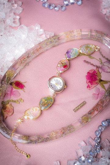具有強烈Pamycarie風格的手錶,日本製錶芯配上人手押製的小花樹脂標本,多彩、華麗,讓觀察時間流逝變成一種樂趣。Material | 材料Finishing | 加工Fading Resistant | Anti-allergy防脫色 | 防敏感Size | 大小Packaging | 包裝All products will be nicely and carefully packed in our wooden boxes.我們會備有精美木盒包裝 ,為產品提供最完善的保護。 Tailormade | 個人化訂造A complimentary 2-month warranty included in each purchase. Customization after purchase is welcomed. (size, length, etc.) Please visit our concept store to enjoy your warranty service. Address: Pamycarie, Shop B218, B2 Floor, K11, 18 Hanoi Road, Tsim Sha Tsui, Hong Kong客人購入作品後可享兩個月產品保養,歡迎親臨Pamycarie K11概念店進行長度/大小更改。 地址:香港九龍尖沙咀河內道18號K11 B2樓B218店鋪 11AM-930PMHandcrafted in Hong Kong | 產地香港 手工製作All products are made-to-order. Please note that each of the handcrafted products is unique and may slightly vary from website images. We will make sure to only deliver perfections to our customers. 所有作品均為接單訂製,請注意每件手製作品均為獨一無二,可能與相片有微小出入,但我們會確保把最完美的作品送到客人手上。Purchased item(s) will be shipped out within 10-14 business days. For urgent orders, please kindly contact us to check inventory before placing your orders. You may choose to pick up your parcel at our stores or have the parcel mailed by HK Post or SF Express. 作品會於下單後的10至14個工作天內完成並寄出。若希望查詢現貨/急件,請於下單前預先聯絡我們確認存貨量。客人可選擇親臨Pamycarie店自取作品,或是選擇香港郵政或順豐郵寄服務。後記Pamycarie 冬季系列以大家心底裡那一抺寂寞作為靈感,設計出一系列乾燥色調的花系飾物。矢車菊(Centaurea)、蜀葵與玫瑰作為主題花,象徵著我們勇於去愛、堅持與被治癒,用不同角度刻畫出糾纏不清的愛與孤獨感。