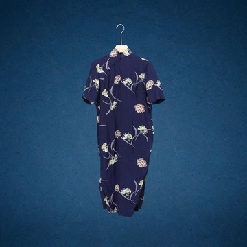 二手 深藍色 康乃馨花紋 古董訂製 長袖 旗袍 CA1125