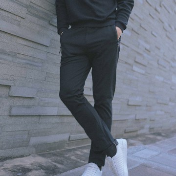 【換季特賣】防水拉鍊純棉素面鬆緊小直筒男長褲│黑色