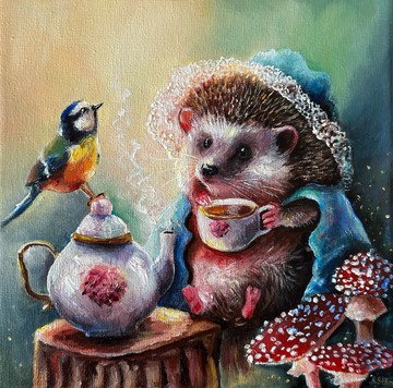 100% 畫布原創繪畫,獨一無二。刺蝟和雀的獨特藝術作品是用壓克力顏料在拉伸棉畫布上繪製的。獨一無二。劇情很獨特:還有什麼比在陽光明媚的日子裡在童話花園裡喝茶更童話的呢。這件異想天開的藝術品非常細緻,像森林一樣,充滿了野生動物的精神。它將為家裡帶來迷人的森林氛圍。送給大自然和動物愛好者的絕佳禮物。作品名稱:《花園裡的茶會》年份:2025尺寸:20×20×1.5厘米有光澤的清漆。包裝精美。材質:壓克力顏料、拉伸棉帆布、保護清漆。這幅畫沒有裝框,但邊緣也有顏色。請注意,顏色可能會因您的顯示器設定而異