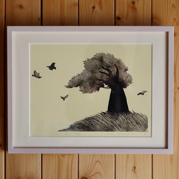 風從山上吹過 帶框的圖片風從山上吹過。鳥兒乘風飛翔它是使用蝕刻技術創建的。它已裝框,因此您可以立即展示它。/影像尺寸/ 19cmx27cm/額頭尺寸/29cmx38cm