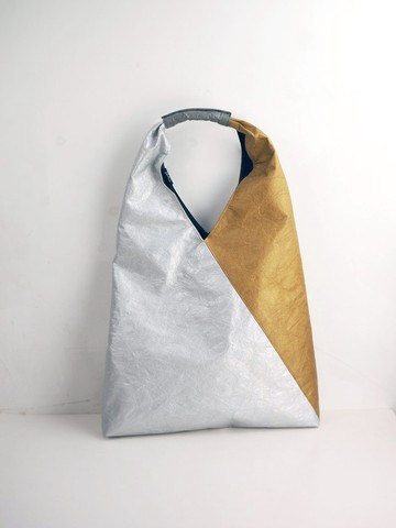 【關於「6 dots」 】簡單的六點:「……」,可以創造出數不盡的組合。抱著「創造」的信念,創造出無限的可能性,沒有框架及包袱,用不一樣的材料,創造出不一樣的東西,為我們的生活創造出更多的可能性及活力。【6dots Tyvek 金銀色 三角形包 單肩包 】6dots 選用兩種不同顏色的Tyvek材料拼搭已成, 前後兩面呈現出不同顏色的圖案, 非常獨特!另採用防潑水的Tyvek材料,材料超輕,整個包包重量只有約「175g」!包包設有拉鍊內袋,可放置銀包或鎖匙等小物品。/ 商品尺寸 / 39 cm (闊) x 57 cm (高) x 6 cm (厚)/ 重量 / 約175g/ 材質 / Tyvek防水材料 + 黑色內裡/ 內袋 /一個拉鍊內袋【物料】杜邦™ Tyvek®材料屬杜邦專利製成,同時有紙張、薄膜及布料的特質,具防水、透氣,質輕、強韌、耐撕裂、抗紫外線等特點【包裝方式】我們會用不織布袋包裝。【製作時間】由於我們每件產品均度身訂造,所以每件產品製作需要4-5天。如你有特別需要,想提前收到,可以預早跟我們聯絡,我們會盡力安排。【運送方式及時間】不論任何目的地,均是免運費!「目的地:香港」可選郵政(設有追蹤碼)/順豐站自取兩種方式(順豐站自取,購買時請提供順豐站地址)「目的地:台灣」採用順豐快遞服務,需時2-3天就送到!「目的地:中國」採用中通快遞,一般需時3至5天不等。「目的地:海外各地」採用香港郵政服務,一般需時5至12天不等。【產地】:香港