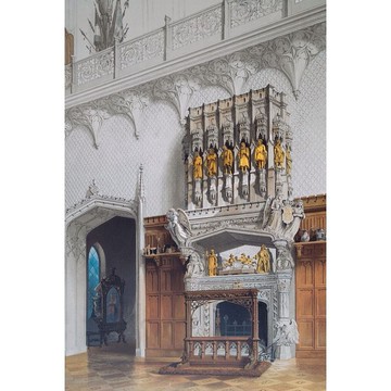 【圖1 - 圖6 為原件圖】【圖7 為巴伯斯貝格堡(Schloss Babelsberg)今日鳥瞰】作者:Carl Graeb (1816~1884)名稱:【巴伯斯貝格堡華麗壁爐】:出自【巴伯斯貝格堡:十二幅水彩】(Schloss Babelsberg. Zwölf Aquarelle)第七張。署名:無(Potsdam, Ferdinand Riegel Verlag)。技法:彩色石版版畫。年代:1853年。尺寸:紙面54 x 41/ 畫面40 x 30 / 卡紙50 x 70 cm。(BO 083-7)備註:含雙層卡紙裝裱 (不含框)這張彩色石版,出自【巴伯斯貝格堡:十二幅水彩】圖冊,紀錄了巴伯斯貝格堡(Schloss Babelsberg)的內外景緻。這座城堡建於1833~1849年,分兩個階段完成,是當時普魯士威廉王子(Wilhelm Friedrich Ludwig, 1797~1888)的夏宮所在。1829年,威廉和奧古斯塔·卡特琳(Augusta Marie Luise Katharina, 1811~1890)成婚,當時的普魯士國王腓特烈·威廉三世(Friedrich Wilhelm III, 1770~1840)出資為二兒子在波茨坦(Potsdam)的巴伯斯貝格城區建造居所,由知名的新古典主義建築師卡爾·弗里德里希·申克爾(Karl Friedrich Schinkel, 1781~1841)負責設計,由於當時歐洲流行哥德式的復古風潮,設計遂以哥德風為主軸。在德國浪漫主義的這個時期,城堡象徵著德意志的整體,加上威廉的妻子奧古斯塔迷戀英國的哥德風格,並自行專研,在設計上和建築師申克爾多所衝突。然而,最後由於經費不足,城堡整體設計只完成了一部分。1835年10月,第一階段落成,新哥德式的落地大窗引進大量光線,可以飽覽周圍的風景,另外,也包含了做為餐廳的八角建築。1840年,登基為王的威廉四世(Friedrich Wilhelm IV, 1795~1861)沒有孩子,因而弟弟威廉成為儲君,他在巴伯斯貝格的住所便顯得寒酸,不夠體面。於是,原本的設計繼續執行,但申克爾於1841年過世,他的弟子帕希尤斯(Friedrich Ludwig Persius, 1803 ~1845)接續建築工程,但仍在執行上和奧古斯塔公主意見不一,最後只能屈就。兩層樓高的舞廳出現,原本的八角建築恢復成為茶點沙龍,新的西側除了許多給孩子們的房間外,也增加了大廳型的餐廳,最後再加上一座雄偉的塔樓。帕希尤斯去世後,(Johann Heinrich Strack, 1805~1880)為整體工程收尾,至少,他的建築想法符合奧古斯塔公主的品味。1849年10月,巴伯斯貝格堡完工。1861年,威廉登基成為普魯士國王威廉一世,1871年,普法戰爭後,更成為德意志帝國的第一任皇帝。1862年9月22日,威廉一世在巴伯斯貝格堡接待奧托·馮·俾斯麥(Otto Eduard Leopold von Bismarck, 1815~1898),商議國是,最後任命卑斯麥為首相,藉此開展了德意志歷史的新篇章。威廉死前,一直住在巴伯斯貝格堡,1907年,此處原本要繼續擴建,以便德意志帝國末代王儲普魯士的威廉(Wilhelm von Preußen, 1882~1951)使用,但最後作罷。今天這裡連同波茨坦和柏林宮殿與公園建築群,被列入世界文化遺產名錄。十九世紀40年代,普魯士國王威廉四世和皇后委託藝術家卡爾・葛雷伯(Carl Georg Anton Graeb, 1816 ~ 1884)繪製波茨坦和近郊及夏洛特堡的建築風光,數量高達94張,其中包括了12張巴伯斯貝格堡的景緻。葛雷伯是十九世紀上半葉德國浪漫主義風景大師,當時普魯士美院教授卡爾・布萊森(Carl Eduard Ferdinand Blechen, 1798 ~1840) 的學生,也向當時的宮廷畫師,他未來的丈人約翰・蓋斯特(Johann Gerst, 1792~1854)學畫。1838年,他成為柏林國王市立劇院的劇場畫家,但十四個月後,便周遊歐洲各地長達四年,並不時展出自己旅行途中的作品。1844年,他回到柏林,和丈人開設劇場裝飾畫作坊,直到1851年被任命為宮廷畫家為止。1853年,波茨坦的費迪南・里格(Ferdinand Riegel)出版社委由不同的版畫藝師與作坊,將葛雷伯的12張巴伯斯貝格堡水彩畫作,翻製成彩色石版畫冊。多幅版畫作品來自柏林在地的石版畫家威廉・洛耶洛(Wilhelm Loeillot, 1804~1881) 及溫克曼父子印刷作坊(Druckerei Winckelmann & Söhne),最後以【巴伯斯貝格堡:十二幅寫生水彩】(Schloss Babelsberg. Zwölf Aquarelle nach der Natur gezeichnet )之名發行。今天,第一版已難尋見,連波茨坦博物館(Potsdam Museum)也只藏有其中的兩幅石版畫面。之後,柏林恩斯特與孔恩出版社(Verlag Ernst und Korn)再次發行巴伯斯貝格堡的畫冊,從預購者名單中,可以知道當時一共印製了126套,多是王公貴族與商賈顯貴,而且發行年為代1872年,正是這座城堡的主人普魯士國王威廉一世成為德意志帝國的第一任皇帝的隔年,宣揚與展示皇帝行宮的企圖不言可喻。1872年,為了慶祝巴伯斯貝格堡的主人威廉成為德意志帝國的第一任皇帝,恩斯特與孔恩出版社以第一版的印版,重新印製出版,同時配上由柏林愛德華・亨奈爾(Eduard Haenel)印刷作坊製作,飾有皇室紋章的石版裝飾框線。今天,就連1872年第二版的完整版本,亦十分罕見,多只有少量的單頁在流通。我們另有一套保有原來赭紅色壓花的收藏畫夾,以及巴伯斯貝格堡的花體燙金字母的完整畫冊。(1872年,第二版【巴伯斯貝格堡:十二幅寫生水彩】訊息,請見【家+藝術】官網_【巴伯斯貝格堡】:德皇威廉一世的新哥德風城堡。)*有任何細節問題歡迎發訊聯絡設計師 *本設計館商品主以西洋古董、舊首飾家飾品、歐洲老原件版畫為主,老件商品難免有歷史歲月的痕跡,但以個人的品味巧妙安置,各司其位,可促成不凡的生活品味與美學理念。然介意者仍請先慎重考慮再下單。