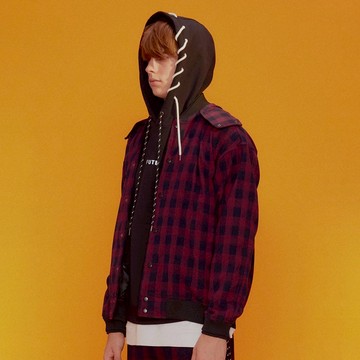 【Off-season sale】中性款 可拆帽 格紋棒球外套 / 紅藍格紋