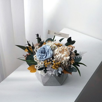 ▲▲此款可擴香。白色牡丹可滴上精油香氛喔~花插上的字卡可以幫您客製喔~▲▲▲▲設計概念▲▲這款桌花使用日本大地農場有機永生不凋玫瑰/不凋繡球,藍綠色主色玫瑰搭配漸層同系繡球的配色以及跳色的橘黃。復古而溫馨的配色配水泥多角盆器體現出溫潤豐收的氣質喔,好好照顧可以觀賞3年以上喔~若需做成捧花請來信客製報價喔繡球花花語——希望玫瑰花語——純潔永恆的愛▲▲尺寸▲▲高17cm寬20cm(因自然花型的關係正負加減2cm)▲▲材質▲▲使用日本大地農場有機永生花/保鮮花/不凋花玫瑰、繡球、滿天星以及乾燥花。本館採用的素材皆為精選花葉材,八成來自日本不凋花協會認證有機優良素材。二成為進口乾燥花葉材。選自品牌與口碑良好的花店。請安心選購。▲▲包裝介紹▲▲附如圖片禮盒。寄出時會有完整的防撞包裝,請安心選購。▲▲代寫卡片服務請加購▲▲https://www.pinkoi.com/product/xABSHMdf?cat...▲▲注意事項▲▲商品皆以自然光(日光)拍攝,拍攝皆是使用自動白平衡,為求照片色澤如實。但每個人對顏色的認知還是會有些為出入。尤其我們採用天然植物,並無法保證每一件作品都如同照片色澤一模一樣。永生花/乾燥花本身色彩多樣依濕度、光線、每個季節出產的天然染劑都會影響他的顏色。所以對花朵顏色特別講究的朋友請一定要向我們詢問。非常感謝▲▲保存方式▲▲不凋花/永生花/保鮮花/恆星花觀賞期限:3-5年◇不凋花不需要澆水◇避免潮濕及陽光直射。儘量置於通風、乾燥的環境◇若氣候潮濕花瓣呈現略透明狀是會正常的現象, 請開除濕機讓花瓣除溼。◇若沾染灰塵請用柔軟毛(毛筆或粉底刷)輕柔清掃乾燥花◇乾燥花基本上都可放上3~5年,乾燥花葉材為自然乾燥,難免會有葉子、花瓣、果實褪色、剝落現象皆為正常◇避免潮濕及陽光直射。儘量置於通風、乾燥的環境◇若沾染灰塵請用柔軟毛(毛筆或粉底刷)輕柔清掃◇乾燥花不需要澆水※永生花/不凋花小常識※不凋花的由來:不凋花源自德國與比利時共同技術研發,後來傳到日本,講究的工藝與技術,將不凋花的花朵藝術廣為流傳。讓不凋花成為日本國人的愛用花之一,加上保存期比鮮花長,幾乎成為日本各家各戶都會擺放的小品藝術。不凋花的製作流程:鮮花整理 → 脱水、脱色 → 上色 → 乾燥。每一次的製作都有可能會染出不同深淺的顏色。不凋花的魅力介紹:一朵不凋花從鮮花開始製作到乾燥完成大約要 1~1.5 個月時間。非常費工也很困難,因此不凋花的價格才會居高不下。在鮮花盛開最美麗的時期保存加工,不需澆水、照樣可放 1~2年。在適當環境下保存得好,甚至超過 5年也不會凋謝。不凋花會因為溫度、溼度、時間,慢慢的變化顏色或狀態,這也正是不凋花的特色魅力。製作的過程費時又費工,所以挑選花材也需特別仔細!每一朵不凋花都是如此精挑細選,所以才會更顯珍貴特殊。不凋花沒有花粉更不用擔心有花粉症或香味過敏的困擾。