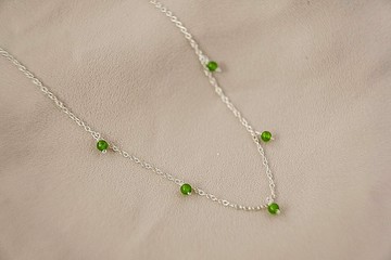 __玉 Jade__玉,其實是一種石頭,卻有水的溫潤。八千多年前,中國人的祖先就開始崇尚玉了,最初的玉,是人與神進行溝通的媒介。玉的象形字,就是三塊美玉用一根絲繩貫穿起來,稱「三玉之連」,指玉通天、地、人。古人認為,玉可通神,神的旨意會通過玉來傳達,順應天意者也可通過玉與神溝通,得到神的護佑。■五月誕生石■可獲神明護佑、趨吉避凶、擋災■加強人體磁場的正能量■醒腦益智、思緒清晰■排毒養顏、滋陰補陽■增強人體免疫功能,提高機體的抗病防病能力■延年益壽,讓人容顏不老,青春永駐-極簡細緻迷你綠玉項鍊,小清新設計適合不同年齡層的女性,另外,鏈尾帶有同系列寶石。飾品可由925純銀製成,非常適合敏感的皮膚。 (__容易過敏的小仙女請選銀色__)★★★完全自然:不經過染色處理。寶石的顏色和風格相似,但有些石頭上有輕微的內雲霧、天然有機物,但不會影響光澤或顏色。(石頭會和圖片可能會有稍微不同。)-★ **材質**綠玉925純銀14k包金★ **尺寸**綠玉: 3 mm40 + 5 cm 延長鍊 展示在我們的Model上https://live.staticflickr.com/65535/49776358118_af5e313a73.jpg-★ **關於包裝(升級) & 材質介紹**https://www.pinkoi.com/product/32Bg4dW7?category=2&ref_itemlist=qzDk9LZz★ **客製化服務 加購 -手敲字鍊尾/ 吊飾**https://www.pinkoi.com/product/exdFUaVN★ **關注Instagram最新消息**#robber925silver-★ **免費客製化送禮**我們提供免費電腦打字卡片服務,各國語言都能代製,以西式信封格式為主,請留下以下資料。◇ __收禮物方的 稱謂/名字__◇ __卡片內文-給對方的話__◇ __您的 稱謂/名字__(若包裹是直接寄到對方地址,請留下備註給我們,並且把收件地址留下對方的資料)https://live.staticflickr.com/65535/50015580077_60ab9227cc.jpg-★ **關於水晶的消磁淨化**水晶是有磁場的礦物結晶體,而我們人類也是有磁性的生物。當水晶與人接觸時,它會與我們的磁場互相作用。因此,在許多文化裡我們都會將水晶注入「願望」,這個願望代表的就是一種能量。水晶就跟衣服一樣,長期配戴是需要清洗的,裡面很有可能藏汙納垢造成配戴的人身體不適。所以定期清洗是需要的。一般消磁一次可維持 1~3 個月!■__日光凈化法__:利用陽光直接照射,最好在早上到中午前左右的陽光是最適當,約2小時,如果不小心超過時間也沒關係,但是一定要在日落前收回來。適合寶石:黑曜石、白水晶■__月光凈化法__:在滿月時曬效果更好,曬2~3小時■__海鹽水浸泡法__: 鹽:水的比例為 1:10,消磁時間至少 24 小時,最長不超過三天。■__晶簇充電法__:家裡有水晶洞或者晶簇,就直接把水晶放在晶簇或晶洞裡。晶洞裡面的磁場會與手環的磁場互相震盪,產生共振效果。在這個共振的狀態裡,就會把不好的磁場給擠出去。消磁時間至少 24 小時。-★ **購買前須知**:: Robber Silver個人工作室手作。:: 台灣設計、台灣製造。:: 純手工製品,實品與照片可能有些微規格上的差異。:: 取自天然素材的材料,會有自身顏色、紋理和冰裂的顏色差異,這是天然素材最珍貴的魅力所在,並非瑕疵,請體諒並慎重考慮後在下單。:: 『慢時尚』我們崇尚環保、綠時尚的議題,好的金屬物件可以伴隨著您長久的時間,藉由減緩汰舊換新的速度,來減少廢棄金屬物的產量,簡約百搭的款式點綴著未來充滿綠色的世界。:: 我們使用純銀/注金製作商品,適合大部分的敏感肌膚,但因每個人的過敏源不同,請在購買前慎重考慮。:: 商品使用後若感到肌膚不適,請立刻停止使用,並諮詢專業醫師:: 訂購過後約2-10工作天天從台灣中華郵政發出。(不包含運送時間) 如果趕時間可以聯絡我們提供快捷諮詢。:: 寄出後的到達時間因國家而有不同。(國際包裹會比國內包裹擁有更多不確定性):: 每份訂單內都含有拭銀布與珠寶照顧說明。-謝謝您的訪問停留,如果有任何問題歡迎隨時聯繫我。-Robber Silver-Jenny L.