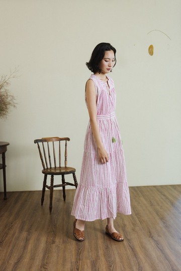 無袖前綁帶分層洋裝_紅綠直條