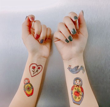 【寄送香港地區】住宅區順豐會加收20港幣的費用,偏遠區會加收30港幣的費用https://farm5.staticflickr.com/4584/37646328405_a9b941a7e1.jpg【 俄羅斯娃娃 刺青貼紙 Russian Dolls】俄羅斯娃娃是小女孩的玩具,男孩也會送給女孩,當作表白禮物,鮮豔色彩的木製玩偶,有著浪漫和甜美的想像,一個套住一個打開有著無限驚喜。https://farm5.staticflickr.com/4576/24705472518_6e0635f3e0.jpg【 款式設計概念 】❤ 鮮豔飽和的色彩❤ 一張附上許多的裝飾配件,可隨自己喜愛搭配❤ 燙金點綴,在不同光線角度下呈現不同效果❤ 手繪設計讓娃娃呈現柔和生動的溫度感 — — — — — — — — — — — — —【 商品尺寸】❤ 商品內容/ 一包內附兩張❤ 商品尺寸/ 約10.1 cm x 10.1 cm ❤ 品牌國家/ 英國倫敦 — — — — — — — — — — — — —【 產品使用說明 】1. 決定好喜歡的圖案後將它剪下2. 將肌膚上的乳液、護手霜及防曬油等...清除乾淨,以免影響黏貼效果 3. 撕除刺青貼紙上的透明塑膠膜4. 參照背面的浮水印圖案選定要貼上的位置後,將圖案面朝下緊貼於皮膚上,越服貼效果越好5. 用水將刺青貼紙背面沾濕並輕壓約30秒(請耐心等候喔)6. 小心撕除背紙後再輕輕的使用冷水抹在圖案上來呈現最好的效果7. 將其他未使用到的圖案重覆以上步驟貼於皮膚上,創造屬於個人獨特的亮眼飾品!❤ 如何清除:使用嬰兒油敷於圖案上並等待約10秒後,再用化妝棉擦拭去除。https://vimeo.com/192446184❤ 產品安全性:*無毒、安全且不易過敏