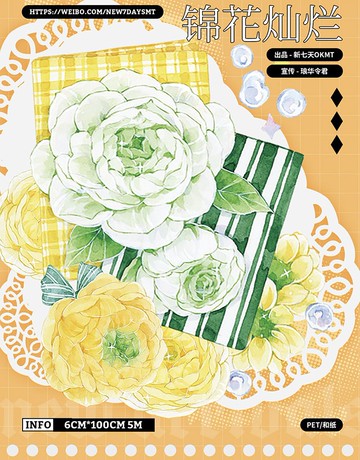 **錦花燦爛**(細節圖案請見下方圖文)PET 數碼印刷 材質:PET尺寸:6cm x 5m 循環長度100cm特殊工藝塗層:白墨PET A款材質:PET 工藝: 特油 紙質離型紙尺寸:11.5cm x 3m 循環長度35cm 8.5循環/卷PET B款材質:PET 工藝: 特油 紙質離型紙尺寸:6.5cm x 3m 循環長度35cm 8.5循環/卷**關於 PET 數碼印刷**工藝原理跟打印機一樣,圖案是打印上去的,承印商為瑪仕金優點 1/ 循環長度超過35cm 2/ 色彩還原度更高顏色更鮮亮 3/ 能生產特殊工藝缺點 1/ 有噪點 2/ PET材質油墨圖層附著力較差容易掉墨,拼貼時需要小心,不要摳圖案,不適合反復拼貼,建議一次拼貼完成 3/ 白墨較薄還是會透底的PET 數碼印刷用選用透明離型紙,喜歡長循環的你可以選擇它**關於 PET**高清6色印刷枳印製,技術成熟,性價比高優點 1/ 圖案高清無噪點 2/ 油墨附著力好,不掉墨 3/ 特油更厚有立體感缺點 1/ 循環固定35cm 2/ 白墨較薄 (數碼印刷的要更厚一些)PET高清印刷各方面表現都不錯,選用紙質離型紙,對新手更友好**購前須知**1/ 實物會有些許色差,實際顏色以實物為准2/ 膠帶封口處會載切不平、圖案不完整及留膠本設計館每卷膠帶都多了10cm來解決這個問題3/ 特油在1mm內的移位屬正常情況4/ 紙膠帶是一種很薄半透的紙,材質本身是微黃的,非純白色而PET是一種類似尼龍透明的材質5/ 膠帶上的圖案需自己裁剪**拍下商品即默認上述 為了您的權益 請在購買前仔細閱讀****如在使用中有任何疑問 歡迎諮詢設計師**https://gd1.alicdn.com/imgextra/i3/367406/O1CN01LRveLK24a016cT1dS_!!367406.jpghttps://gd3.alicdn.com/imgextra/i2/367406/O1CN01mAN71q24a01Q06EIm_!!367406.jpghttps://gd4.alicdn.com/imgextra/i1/367406/O1CN019QDYSm24a01IdWuzr_!!367406.jpg