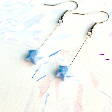 幸運流星輕輕地在耳邊擺動同時將一切願望都變成真。每一顆紙星星都經人手悉心摺疊,表面塗上搪瓷定型,質感光滑堅固,通過防水測試。願每顆幸運星都為您帶來好運!- 款式簡單帶出可愛又跳皮的感覺,反光度像是星星在天上閃閃發亮。- 適合不同場合﹐搭配多樣衣著。材質: 搪瓷、珍珠紙星星尺寸: ~8(W) x 8(H) mm長度: ~45 mm顏色: 粉藍*請放心﹐所用的紙質較厚﹐經過多層摺疊﹐加上防水外層﹐耳環十分堅固的喔。