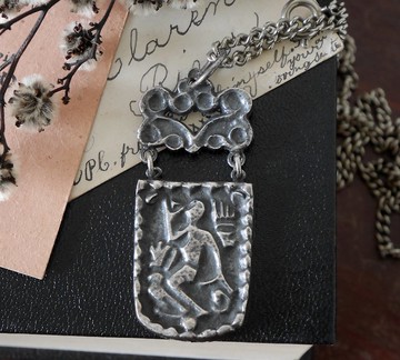 特殊神秘圖騰項鍊。購自法國,背面有標記。材質為銀質,很厚實,狀況不錯。總鍊長70公分,墜子5.7x2.5公分。* 清潔方式-使用乾布擦拭。-勿使用拭銀布,『不可以』戴去海邊及泡溫泉,也不能戴著在雨中起舞。-戴完請清潔後,放在夾鏈袋保存。-存放地點請保持乾燥。*小叮嚀賣場每一樣商品都是檢查過,確定使用正常才會販售,故無法因為個人因素退款退貨哦。因攝影的光線及每台電腦顯示不同,照片與實品顏色都會有些許落差。如有其他問題請不用害羞,直接聯繫我哦!謝謝點閱。