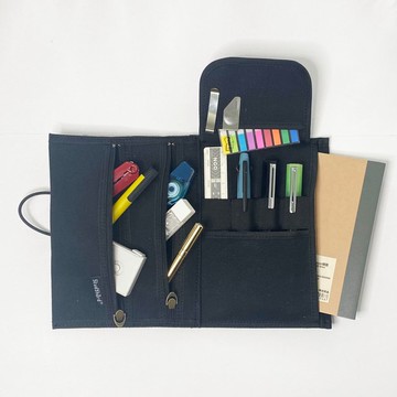 採用 100% 純棉製成的 **10 號蠟防水加工帆布**筆袋。此材質耐用度高,初次使用時可能會感覺較硬,但隨著時間推移會變得柔軟服貼,__可享受其隨時間變化的質感。__拉鍊採用 **YKK 3 Coil**,而成為設計亮點的__鬆緊繩也選用安心的工業級用品__,品質可靠,__可長久使用,不易損壞。__https://live.staticflickr.com/65535/54795476673_31865fa1bb_w.jpg產品尺寸為對折狀態下,長 18 公分 x 寬 12 公分的__精巧尺寸__。左側的兩個拉鍊口袋為自由空間,可分類收納橡皮擦、自動鉛筆筆芯盒等配件。右側除了 A6 尺寸筆記本外,還可收納長度達 16 公分的尺,以及 3 支常用筆。**注意事項:圖中作為收納參考的筆等文具用品均不包含在產品內。**【關於 10 號帆布蠟防水加工】產品在縫製過程中會產生摺痕(白色線條)。這是蠟加工的必然特徵,並非布料瑕疵。
