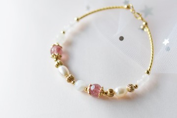 https://live.staticflickr.com/65535/48808037578_8a05d345ae_o_d.jpg**↳ 材質說明 **→ 草莓晶 6mm→ 月亮石 5.5mm→ 馬粉 4mm→ 淡水珍珠 5mm→ 14K包金配件/圓珠/隔片**↳ 尺寸說明 **→ 鏈長: 15.5cm /16.5cm + 3cm(尾鍊)https://farm5.staticflickr.com/4841/46786607601_b01851474f_k_d.jpghttps://live.staticflickr.com/65535/48808164878_321f2ace05_o_d.jpghttps://live.staticflickr.com/65535/48810022977_fa6a65746a_k_d.jpghttps://live.staticflickr.com/65535/48808529613_b861a1cc83_o_d.jpg** ↳ 包裝內容說明** 如若購買一件以上,我們是會把飾物都放在同一個紙袋內包裝的喔,如需分開包裝,請購買時備注。為支持環保,不提供任何塑膠袋唷,以上的夾鍊袋、卡片和紙袋希望你收到後能重用 (⁎⁍̴̛ᴗ⁍̴̛⁎)**加購禮物包裝連結:**https://www.pinkoi.com/product/3wDRzcL6?category=3https://live.staticflickr.com/65535/48808514821_a84bbd3353_k_d.jpg**↳ 運費&運送時間****→香港地區:【香港郵政】平郵**由寄出當日開始計3~5個工作天(若希望寄順豐請聯絡我們,只接受"到付")**→台灣地區:【香港郵政】掛號(追蹤號)**由寄出當日開始計7~15個工作天**→ 海外地區:【香港郵政】掛號(追蹤號)**由寄出當日開始計10~20個工作天因為太多客人反映平郵包裹寄失了,所以我們決定台灣及海外地區一律寄掛號空郵(追蹤號),雖然運費較高但能確定包裹能到達你們的手上。運送時間是我們所不能控制的,在亞洲地區都大概在20個工作天內,香港地區5天內。掛號需要簽收,但不會有電話訊息接收提示,順豐站、7-11便利店等等都不會代收件的喔,請購買時一定要填寫你家的地址或是確認可以接收香港郵政的地址,否則郵件會拒收退件的,如果因為填寫錯誤地址等人為因數而無法送達的話我們不會免費補發也不會退款,需要由買家再付運費才會補發。** ↳ 代寫小字條** 可免費代寫紙條,請在購買前或後盡快通知我們,英語或中文都可以,字數請在20字以內,不通知的話不會自動提供。** ↳ 飾品保養方法** ☆黃銅/純銀: 黃銅/純銀飾品佩戴時都會因為接觸到空氣和我們的皮脂和汗水以及潮濕天氣,而發生微氧化金屬光澤變得暗淡,建議每天佩戴後可以收納至我們附上的夾鍊袋或手飾盒中,減少接觸空氣的機率,以延長飾品的壽命。我們包裝內附有一片黑紙,那是**「防氧化片」**喔,請不要丟掉,把它跟你的飾物一起密封收藏可以減低氧化速度。** ↳ 如果氧化的話也不用擔心** 可用拭銀布或眼鏡布擦拭,沒有拭銀布的話可將牙膏擠在化妝棉上來當拭銀布用,然後用清水沖洗乾淨再用乾爽的棉布抹乾。純銀的可以使用海棠粉擦拭,又便宜又可以立即變亮。女孩們切勿在飾物上直接噴上香水,會直接減少飾品的壽命喔!** ↳ 天然石&水晶** 雖然是石頭,但是請溫柔地對待他們 ^^水晶是需要淨化/消磁的,每過一段時間就需要淨化,最簡單的方法就是光照法-曬月光,月光代表的是陰性,也是屬於比較柔性的光線。一般水晶都適合光照法,而光照法的消磁時間至少要 3 小時。以下連結有詳細解說各種淨化方法唷。 https://www.pinkoi.com/magz/1_WBqVGZ** 產地/製造方式** MADE IN HONG KONG