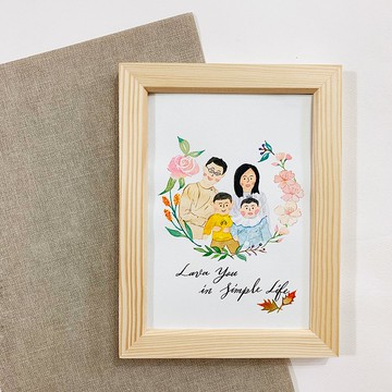 讓設計師為你繪製獨一無二的水彩可愛人像掛畫吧!設計師會以水彩花圈和西洋書法元素,配合你所提供的人像,創作出令你滿意的作品喔!設計師會按你的要求以指定色彩創作可愛的水彩人像畫作,送禮自用皆宜喔!https://youtu.be/Wamnl0y20L0水彩畫紙尺吋:13* 18cm相框尺吋:16* 21cm相框能掛於牆上及置放於桌上。設計流程:1. 客人先以站內訊跟設計師聯繫,客人可提供2-3張照片給設計師參考。2. 經基本溝通確認細節後,客人可直接下單。3. 設計師稍後會附上鉛筆稿草圖供客人確認,客人可免費修改鉛筆稿件一次,確認無問題後,設計師會安排上色。4. 上色後不能進行任何修改喔!註:如要訂製此項產品,請先跟設計師聯繫喔!請注意客製化商品一律不接受退款退貨申請。相框以當時存貨款式為準,圖片僅供參考。
