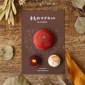 日式風格的贈禮我們將塵封於衣櫃中的和服布料再利用,秉持著宮城縣亙理町高齡女性「能包三粒紅豆的小布,也不應丟棄」的古老智慧,將小塊布料中蘊藏的美感與可愛之處,化為一件件獨特的創作。這份心意,也讓它成為贈送給親友、表達感謝或問候時的精巧伴手禮。使用和服布料製成的和服磁鐵這是冰箱上的必需品,用來張貼家人的留言、孩子的通知,或是食譜。印有日本傳統紋樣「菊文」,能為您的日常生活增添一抹亮麗色彩。象徵幸福的吉祥紋樣這是自古以來被視為「吉祥的象徵」的吉慶紋樣,瞭解和服紋樣的意涵,也是觸及日本文化由來已久的深厚底蘊。<菊文> 象徵「延命長壽」、「青春永駐」、「祈求健康」。自古以來,菊花便被認為具有抗衰老的力量,並被用於藥用。它被視為「百草之王」,是延年益壽的祥瑞之花。商品詳情和服磁鐵 頂級款[尺寸] 直徑 4.8cm × 1個,直徑 2.7cm × 2 個[材質] 和服布料、絲綢<購買注意事項>◎ 所有商品均為手工製作,每個作品的尺寸、形狀和圖案可能略有差異,請理解其為獨一無二的藝術品。◎ 極少數情況下,若能取得保存良好的和服布料,我們會從同一塊布料製作多個作品。由於布料裁切位置的不同,您收到的作品圖案可能與照片略有差異,敬請見諒。◎ 螢幕上顯示的照片與實際商品在顏色和質感上可能會有差異,敬請見諒。若您有疑慮,歡迎來電洽詢或考慮暫緩購買。◎ 作為材料的和服布料多為二手品,且常無標示,因此難以確定其確切材質。我們會在徹底檢查並進行清洗等加工後進行改造。部分佈料遇水可能會褪色或縮水,請務必小心處理。◎ 本商品亦於其他平台販售,若遇缺貨,敬請見諒。