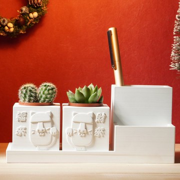 ▍組合內容 ▍- 步步高升筆筒底座*1- 1吋水泥盆*21) 招財摩艾2) 招福摩艾**不含小卡及花插+萬用土**如有需求,歡迎私訊聯絡!▍創作靈感與故事 ▍- 步步高升 水泥筆筒底座形似「上」,以3種由低到高的樓層設計而成,象徵**步步高升**,適合收納辦公室文具及名片,讓桌面整齊有質感,除了自己使用外,作為**升遷賀禮**亦相當合適!- 招財&招福摩艾 1吋多肉水泥盆栽長相天生喜感的摩艾Cosplay日本超人氣吉祥物「**招財貓**」,舉右手招來錢財,舉左手招來福氣,兩個創作的組合代表「**財運福氣一起來**」。▍商品介紹 ▍ - 1吋水泥盆以「在水泥上結合手繪插圖」的概念,繪出一系列生活化、有巧思,能**傳遞心意**的水泥盆器,很適合當辦公療癒小物、擺飾或**送禮**等,可愛且具話題性。- 水泥筆筒底座 可收納文具及多肉盆栽,右邊高筒可收納辦公室需使用到的各式文具(如筆、尺、剪刀);右邊低筒可收納名片、門禁卡等;左邊底座可擺放2個1吋多肉植物水泥盆栽,亦可做為公仔展示台。同時,底座可做為**擴香石**/**擴香座**,加上喜愛的精油/香水/香精,就會散發淡淡香味,讓好香氣持續在你周圍。(註:若擔心於表面殘留痕跡,建議加在底部或不明顯處喔)▍商品特色 ▍ 1) 1吋小盆栽的大小,迷你可愛2) 底部不開洞設計,澆水時不會讓桌面濕答答3) 貼心可兩用,1吋盆栽直接放 or 移植水泥盆https://live.staticflickr.com/65535/50562046146_59a6964d05_b.jpg▍尺寸規格 ▍- 水泥筆筒底座 https://live.staticflickr.com/65535/51688195178_3a620b03f8_z.jpg- 招財摩艾https://live.staticflickr.com/65535/51104911192_6e057fc956_b.jpg- 招福摩艾https://live.staticflickr.com/65535/51104818161_023ded0f2b_b.jpg▍植物搭配 ▍1) 1個盆附贈1株多肉植物2) **隨機出貨**,以當季、好照顧的品種為主3) 夏季景天科產量少,將以其他科別多肉出貨▍貼心服務 ▍1) 附**多肉專用土**,供因運送灑土填補使用2) 附**滴管**,供澆水使用▍植物運送須知 ▍1) 植物與盆器**分開包裝**2) 到貨請盡早取件拆封,好讓植物能透透氣3) 寄出前會盡力做好保護,但運送途中難免會有漏土、植株傾斜之情形,請多包涵▍關於水泥 ▍1) **氣孔**是水泥具代表的特性,隨機出現,每個都是獨一無二!2) 水泥易受氣候濕度影響,每個色澤有些微差異3) 底部僅做微打磨修飾,保留灌注的原始風貌4) 水泥係屬堅硬但易碎的材質,使用時請**輕放**▍出貨須知 ▍- 出貨時間本設計館商品多為接單製作,一般為**3-5天**出貨,如遇送禮旺季/氣候影響為5-10天出貨,建議提早下單或私訊討論,以確保能在時間內送達。- 運送風險商品出貨前會嚴謹包裝,若於運送過程中,導致嚴重瑕疵與損壞,還請拆封時,拍照並保留完整包裝,通知我們以便為您做更換。▼升遷禮物相關連結▼【升遷禮物2】步步高升水泥筆筒底座 & 平安是福多肉盆栽 3件組https://www.pinkoi.com/product/TdL88Qxq【升遷禮物3】步步高升水泥筆筒底座 & 準時下班多肉盆栽 3件組https://www.pinkoi.com/product/VYdBERbn【升遷禮物4】步步高升水泥筆筒底座 & 升官摩艾多肉盆栽 3件組https://www.pinkoi.com/product/6vvUtqUW▍ 以下**補充**,歡迎隨時回來**複習**或私訊交流 ▍- **植物照顧小卡**Q1.植物的照顧方式?環境 | 通風良好**澆水** | 入門 | 夏天1周1次;冬天2~3周1次澆水 | 進階 | 觀察到土壤乾燥或葉片產生皺褶日照 | 依需求大至小:景天科>仙人掌科>百合科**移盆** | 可與原培養土一起種入,減少植物適應新環境的不良反應Q2.多肉植物常見種類?1) 仙人掌科:折墨、仙女閣、銀手毬、紫太陽、雪晃、白烏帽子(米老鼠,象徵節節高升)等2) 百合科:九輪塔、水晶壽、白羊宮、十二之卷及鷹爪(花語抓錢滿滿)等3) 景天科:兔耳、靜夜玉墜、翡翠、樹冰等Q3.多肉植物的生長季節?1) 仙人掌科:夏季2) 百合科:春、秋季,屬半日照(遮陰)植物3) 景天科:冬季Q4.多肉植物對於日照的需求?依日照需求量大至小排列為:景天科>仙人掌科>百合科,如果種植於辦公室,可使用**檯燈**,或移至**光線充足**的位置,補充日照需求,植物會比較強壯。Q5.哪一科的多肉最好照顧呢?新手建議可從**仙人掌科**入門,放在辦公室療癒又可以**防小人**,不需頻繁澆水,也可以生長,唯夏天是生長期,可以讓它多照照陽光,避免徒長。