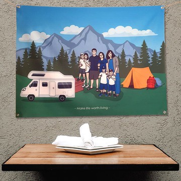 **專屬插畫掛布:個性化露營美學,讓戶外生活更有趣!**想要擁有一幅獨特的露營掛布嗎?我們幫您將人物畫成插畫,並根據您的喜好添加背景和文字,讓您的露營帳篷不僅實用,還能展現個性!無論是凹豆咖風格的插畫,還是登山、野溪背景,我們都能滿足您的需求。當你開心地搭好帳篷,佈置好小小空間後,這片屬於您的精緻掛布將成為焦點。露營不僅僅是戶外活動,它也是一種生活態度和文化。透過這些個性化設計,您可以向家人、朋友展示您獨特的審美,將露營變成一種戶外藝術。此外,對於愛好爬山和登山的旅行者來說,我們的插畫掛布將是您帳篷的最佳點綴,無論是清晨在野溪邊醒來,還是深夜仰望滿天星斗,我們的產品都能為您增添一絲藝術氛圍。掛布上的插畫不僅個性化,也能勾勒出您每一次旅遊和旅行的美好回憶。讓我們的產品陪伴您度過每一次戶外探險吧!無論是爬山、露營還是探索大自然的其他活動,這些獨一無二的掛布都會為您的戶外旅程增添色彩。立即訂製,擁有一幅屬於您的藝術掛布,讓露營文化更貼近您的生活!⚈ 訂做步驟 1. 手繪風格如圖示,請確定風格是否喜歡再下標2. 私訊傳送➜【1張照片】和【文字 20 字以內】3. 等待 14 個工作天就會寄出囉 ( 不含假日與國定假日 )4. 此掛布尺寸是120 x 90cm,若要其他尺寸請私訊我們5. 文字的字體是固定的,無法更動歐6. 畫5人以上或是加背景等其他需求,可私訊設計師,我們會依難度報價給您https://i.pinimg.com/originals/ba/b5/3a/bab53a6c076a9a9b47b1e2eafa14c3c9.jpg⚈ 收到商品你可以 帶去露營 (掛上自己的掛布真的很蝦趴~)居家佈置 (超有紀念價值) 生日禮物 (花少少錢就可以製作)送給自己 (全世界只有一張)日常的小驚喜 (充滿小心思一定會讓他笑開懷)⚈ 注意事項 ◍ 一律不看稿子或修改,能接受再下標歐。◍ 8人以上或有其他需求請私訊告知,會依困難度進行報價。◍ 畫好的作品會放在網路上,若想要保密請提前告知。◍ 作品版權為型爵所有,不得翻版、轉售或以其他方式作商業用途。製作時間:付款後,從製作到寄出為 14 個工作天。( 不含假日 )依順序安排製作,一個一個單獨為您製作,若提前做好會提前出貨,因製作工序繁瑣,無法趕急件敬請見諒。創作媒材:插畫設計 | 電腦繪圖材質:聚酯纖維微透輕量畫布產地:台灣製造 Made in Taiwan四角有銅釦讓使用者方便懸掛,背面三角片增加布的使用壽命。尺寸誤差 : ±3cm~5cm為正常交貨範圍,可接受再下標。此商品為客製化量身訂做,故不接受退換貨。出貨時布幔會折起來,用熨斗低溫乾燙背面即可平整。