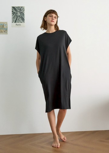 連身/罩衫/睡袍:連身_Travel memory.莫代爾棉短袖開叉口袋睡衣(黑色)