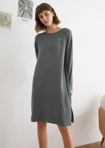 連身_Travel memory.圓領長袖開叉睡衣(鐵灰藍-刺繡Paris)