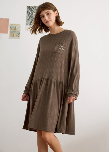 連身_Travel memory.抽針細褶長袖睡衣(布朗棕-刺繡旅行)