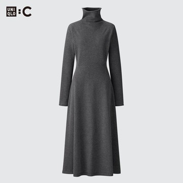 KeyWear奇威名品 高領長袖收腰中長款洋裝-深藍色