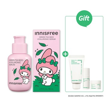 INNISFREE 25週年&My Melody 50週年,為慶祝INNISFREE & My Melody的生日,藉由My Melody秘密配方製成,發現綠茶籽玻尿酸保濕精華的超爆水成分 ♥ 綠茶萃取+玻尿酸的協同作用能夠快速解決肌膚缺水問題,加強保濕屏障幫助肌膚365天長效保濕,打造健康透亮的保濕精華。全膚質適用的國民精華。