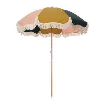 這把傘的頂部是帶有復古流蘇邊緣的帆布,能為您的花園或海灘行程增添一些魅力。